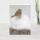 Um pardal de garganta branca fica no topo de um tufo de neve cobrindo um toco de árvore.
