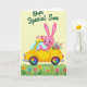 This greeting card features a pink, rabbit-like character with long ears and a wide grin showing two front teeth, leaning forward as it drives a small yellow car 🐰. The car has a tiny red rack on top, and the character’s eager posture gives the scene a friendly, affectionate energy, like it’s rushing to deliver something sweet. A pale yellow sky fills the background in even light, keeping the focus on the bright central figure. Along the bottom, a green strip of ground is scattered with simple flowers in yellow, fuchsia, blue, and purple 🌷. A full bouquet of mixed blossoms spills out from the back of the car, suggesting a thoughtful gift meant for someone close. Near the top, the words “Our Special Son” appear in dark green lettering, centered and easy to spot against the light backdrop. The wheels stand out with rainbow-colored spokes arranged like a pinwheel on each tire.