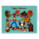 Um cartão de Dia das Bruxas que apresenta espantalho, corujas e abóboras, folhagem de outono e cores de outono