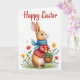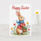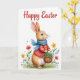 This card features an upright, human-like hare centered on a white background, dressed in a brick-red coat with small golden buttons and a sky-blue fringed scarf that drapes like a snug hug 🐇. The hare’s brown eyes tilt upward with a tender, searching look, and its soft pink nose and fine whiskers add a gentle, friendly charm. Warm brown fur is textured across its body and fades lighter at the belly, giving it a cozy, storybook feel without being fussy. It stands on a small patch of green grass dotted with red, yellow, and tiny blue flowers 🌷, like a quiet garden moment shared with someone close. In its paws, the hare cradles a woven basket filled with leafy greens and several smooth blue egg shapes, held carefully as if saving them for a dear friend. Near the top, a line of crimson text in a flowing handwritten style sits above the character, leaving plenty of open space around it. The blossoms cluster around the grassy base in little pops of red and sunny yellow, with a few small blue blooms tucked between the blades.