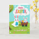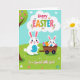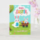 This greeting card shows two upright bunny characters in the lower half, drawn with simple shapes and soft shading, leaning close as if sharing a friendly secret 🐰. The taller bunny has pink-lined ears and a sky-blue belly patch, smiling down with an affectionate, protective look. Next to it, a smaller bunny peeks out from a rustic wooden cart, its bright eyes turned toward its companion like they’re in on the same little adventure 🐇. The cart is piled with patterned egg shapes in mixed colors, arranged like a cheerful harvest of spring treats. Near the top, a cloud-shaped banner holds a festive greeting in multicolored letters, with tiny flower accents sprinkled around the text. On the left side, a tree trunk frames the scene, and its green canopy is dotted with more decorated egg shapes that echo the cart’s stash. Along the bottom edge, a short message sits in a neat line of colored text, set above a grassy strip scattered with small pink, white, and blue flowers 🌷.
