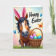 This card features a friendly, stylized horse-like character facing forward with wide, gentle eyes, and its bright pink bunny ears 🐰 add a sweet, flirty twist to the expression. A dark mane frames warm brown fur and a lighter snout, giving the face a soft contrast that feels welcoming, like a friend leaning in for a photo. Beside the character sits a woven basket brimming with glossy eggs in purple, pink, green, yellow, and blue, arranged like a shared treat waiting to be discovered. The ground is a thick spread of green grass, and the sky above fades through soft blue with hints of pink and yellow, like early morning light. Two butterflies—one blue and one orange—float nearby, adding little sparks of motion around the character’s calm, affectionate gaze 🐇. The words “Happy Easter” appear near the top in flowing lettering, set in a dark tone that stands out against the pale sky. The basket’s curved handle arches over the eggs, and the grass blades are drawn with small, textured strokes along the lower edge.