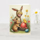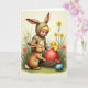 Designed with a springtime scene, the card features a fair-haired child in a tan animal suit with tall ears, standing in soft, diffused light beside a fluffy cocoa-brown rabbit 🐇. The child’s bright blue eyes and rosy cheeks turn toward the rabbit with a tender, trusting look, as if sharing a quiet secret. Near their feet sits a loosely woven nest, drawn with fine strands that feel almost touchable. A large red egg rests in the nest, and a tiny downy yellow chick perches on top, leaning forward as though greeting the pair 🐰. In the grass nearby, a smooth blue egg adds a calm cool note against the fresh green ground. Small yellow flowers and soft pink blossoms dot the scene, framing the characters like a gentle garden border 🌷. The greeting text appears at the top in a simple, dark font, with a smaller line near the bottom in a warm red tone, while the red egg gleams at center with subtle highlights.