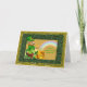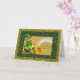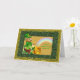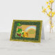 A Leprechaun in his hat and fancy suit sits on a wood stump while holding and viewing his pot of gold and it's rainbow end. Cute and traditional like the fable. You can customize the front and inner text to suit. Has a glittery, sparkle like look and feel to it.