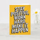 Send a powerful, no-nonsense message of motivation with this high-impact card! The quote, "STAY POSITIVE, WORK HARD, MAKE IT HAPPEN," is rendered in huge, stacked white block letters with a strong black drop shadow, popping off a vivid, sunny yellow background. This design is perfect for encouraging hustle culture, celebrating a new venture, motivating a student through finals, or pushing a business client to achieve their goals. The bold, graphic style is gender-neutral and makes a strong statement of determination and drive.