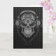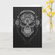 An elaborate DJ sugar skull design decorated with intricate swirls and dot patterns. Headphones sit on top of the skull with two wires hanging below. The complex lines and circles are solid black while the interior of the skull is finished with stainless steel textures and silver colors. The skull sits on top of a steel mesh background which completes this industrial pattern. This aggressive Day of the Dead inspired image is a colourful representation of DJ culture.