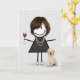 Menina bonitinha em tênis, vestido de bolinhas, colar de pérolas com um copo de vinho tinto e cão de recuperação de ouros em um fundo de terrazzo de cinza mole para aniversário.