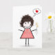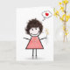 Bonita figura de palito com cabelo, vestido de gingham, colar de pérolas, tênis, e segurando uma buquê de margarida para pensar em você. O fundo branco pode ser alterado.
