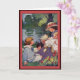 Ilustração colorida de uma família sentada na margem de um rio lendo uma história. Mãe e três crianças parecem legal e confortáveis sob os ramos de uma árvore verde. Borda vermelha e preta.Cartão de destino. Personalizar como desejar