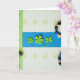 This card shows a tall layout with a cobalt-blue stripe running across the middle, where three green shamrocks sit side by side—two three-leaf clovers leaning in toward a four-leaf clover like close friends sharing a quiet moment 💚. Behind them, a light blue-and-white gingham background is sprinkled with faint lime-green floral outlines that feel like a cozy tabletop scene. Along the left edge, a wide lime-green vertical band resembles a binder spine, dotted with dark round eyelets and a small peek of a clip that adds a tidy, organized touch. On the right edge, a strand of beads drapes downward in glossy black, metallic blue, and textured beige, like an accessory left nearby after a fun evening out ☘️. The overall colors stay cool and fresh, with the greens standing out sharply against the deeper blue center. Any wording would sit neatly over the cobalt stripe in small white letters, centered beneath the shamrocks for easy reading. The beads catch the light in tiny highlights while the shamrocks remain flat and matte against the patterned gingham backdrop.
