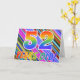 A frente desta divertida, atraente e excitante design de cartões de aniversário apresenta um padrão de riscas coloridas, junto com a mensagem "52 anos!", que apresenta um arco-íris multicolorido como um padrão de gradação. O dentro apresenta uma mensagem de saudação personalizada, ou talvez possa ser apagado e deixado o vazio se uma mensagem for escrita manualmente. Um cartão de boas-vindas como este poderia ser uma maneira divertida e feliz de enviar uma mensagem a alguém que comemora seu cinquenta e segundo aniversário. [~Z0000351]