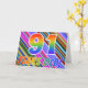 A frente desta divertida, atraente e excitante design de cartões de saudação de aniversário apresenta um padrão de listras multicolorido, juntamente com a mensagem "91 anos!" tendo um padrão de gradação multicolorido inspirado no arco-íris. O dentro apresenta uma mensagem de saudação personalizada, ou talvez possa ser apagado e deixado o vazio se uma mensagem for escrita manualmente. Um cartão de boas-vindas como este pode ser uma maneira divertida de celebrar o 90° aniversário de alguém. [~Z0000351]