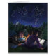 A arte Starry Night de Traci Van Wagoner impressão, posters, acessórios e presentes mostra nossa pintura original de duas crianças e seu grande e negro cão acampando sob as estrelas lendo um livro fantástico ao redor de um fogo no acampamento sobre cavaleiros e dragões. A magia da história está subindo no céu estrelado para mostrar um cavaleiro e um dragão numa dança eterna noturna de estrelas. Aproveite um acampamento noturno de verão nas montanhas.