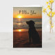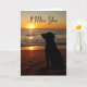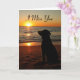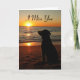 Uma silhueta de um cachorro se senta em uma praia no pôr do sol. As palavras que sinto sua falta acima dela.
