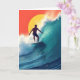 Um surfista dirige uma onda com um grande sol amarelo atrás dele. Placa de Dia de os pais perfeita para a cara que adora surf.