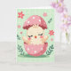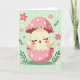 This greeting card features a newly hatched little bird nestled in the jagged top of a bright pink eggshell with white polka dots, its tiny wings lifted as if reaching toward a nearby friend. The chick is a soft cream color with closed eyes, rosy cheeks, and a small open beak, giving it a tender, content look that feels like a quiet hello. Behind it, a light pastel green background is patterned with a faint, uneven grid that adds gentle texture without distracting from the scene. Small five-petaled pink flowers and a few slender green sprigs are scattered around, like springtime notes drifting across the page 🌷. The warm pinks and soft greens sit close together, creating a cozy, affectionate mood in the way the chick seems safely held by the shell. There is no message text printed on the front, leaving open space above and around the illustration for the artwork to breathe. The eggshell’s rim curves upward with irregular cracks, and the white dots vary slightly in spacing across the pink surface 🐇.