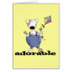 Um cão manchado branco e marrom adorável com uma barriga carnudo que veste macacões da sarja de Nimes voa um papagaio e o texto preto lê "adorável" em t-shirt, em hoodies, em bodysuits, em chapéus, em canecas, em cartões, em etiquetas, no chaveiro, e em mais adoráveis do cão.