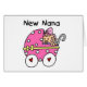 Um bebé adorável em uma carruagem cor-de-rosa e o miúdo denominam o texto que lê "Nana nova" em t-shirt novos de Nana, canecas, cartões, etiquetas, sacolas, ímãs, botões, e outros roupa e presentes novos de Nana.