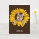 Smiling tabby cat in yellow sunflower for thank you to friend on brown background.