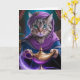A greeting card with a grey Tabby genie who has emerged from a lamp.