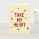 This card features the phrase “TAKE MY HEART” in deep cranberry red, written in a loose brush-letter style that feels honest and a little imperfect. The words sit large in the center, so the message is the first thing you notice. Behind it is a pale yellow background that looks like soft morning light and gives the whole card a gentle glow. Around the text are eight blush-pink hearts, scattered in different sizes like they’re lightly floating. The hearts are simple and rounded, adding a sweet touch without taking attention away from the message. It feels meaningful because it says what you might be shy to say out loud, in a direct and caring way 🥰. This is a lovely choice for a partner, a crush, or even a close friend you want to remind that you care ❤️. Hope it helps you share Valentine’s Day feelings with someone special.