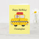 Saudação de aniversário com cartão amarelo design de táxi que você pode personalizar com qualquer texto de sua escolha. Se precisar de ajuda para personalizar, entre em contato conosco através do link desta página. Cartão de aniversário de táxi