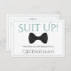 Use este "cartão de padrinho de casamento" para pedir aos seus amigos especiais e familiares para serem padrinhos de casamento no seu casamento. Projetado para coordenar com nossa suíte Elegante de Casamento Teal e Cinzas, ele apresenta uma imagem de uma gravata preta de arco e diz: Encaixe! Seus Serviços são Solicitados como Padrinho de casamento" Há um espaço para inserir uma nota especial perguntando "você será meu padrinho de casamento?" assim como os nomes dos casais de casamento e a data do casamento. Todos os campos são totalmente personalizáveis.