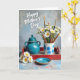Designed with a cozy still-life look, the scene centers on a worn cherry-red wooden tray set against a softly mottled background of muted blues and grays. On the left sits a glossy teal ceramic pot with a lid, its rounded shape catching the light like a quiet companion. On the right, a tall white vase with loose blue brushstrokes holds a fresh bunch of white daisies, their sunny yellow centers leaning together like close friends ❤️. Tucked among the flowers are a few paintbrushes with mixed-color handles and warm, paint-tinted bristles, hinting at someone making art with care. In the foreground, a small teal dish echoes the pot’s color, while a couple of daisies rest nearby as if they’ve just been set down mid-moment 🌼. The greeting “Happy Mother’s Day” appears in white lettering near the upper left, floating gently over the cool-toned background. The white vase is cylindrical with scattered blue strokes, and the daisies cluster tightly at the rim with brush handles peeking out between petals.