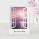 Céu rosa tempestuoso com relâmpagos sobre a água do oceano em uma janela branca aberta. Todo texto é editável.