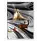 Tempo em retro - cartão vazio. Gramofone com cor-de-rosa e um pulso de disparo em um fundo preto e branco retro do redemoinho. Vazio da esquerda para sua própria mensagem.