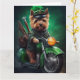 Um amigo peludo atrás do guidão de uma bicicleta verde brilhante, vestindo uma roupa de Dia de São Patrício que chama a atenção. O cão está vestido com um conjunto festivo, completo com uma gravata borboleta verde e um chapéu alto combinando que se ajusta confortavelmente em sua cabeça. A roupa apresenta desenhos intrincados de trevos e duendes, deixando claro que este cão está pronto para celebrar o Dia de São Patrício com estilo.