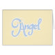 Estas t-shirts e outros artigos têm a palavra "anjo" em letras azuis bonitas com um pequeno halo à volta da letra A.