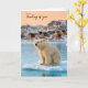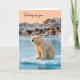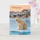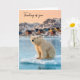 A polar bear is sitting on an ice floe in Greenland, with colorful houses visible in the background.