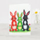 This card shows three stylized bunny figures standing close together on a white background, their gentle smiles and shared glance suggesting easy friendship 🐰. The left bunny is deep red with soft pink inside tall ears and a light cream belly, while the middle bunny is fresh green with pale green inner ears and a golden-yellow belly patch. The third bunny is jet black with red ear linings and a bright white belly, creating a striking contrast beside the brighter pair 🐇. Each has simple dark eyes, a small reddish nose, fine whiskers, and an upward-curving mouth that feels like a quiet, affectionate grin. Below them, a band of bright green grass stretches across the bottom, dotted with small fuchsia and yellow flowers 🌷. Two smooth egg shapes sit tucked in the grass, one red and one golden, adding a festive touch without crowding the scene. A short Easter greeting appears centered near the top in a soft, medium-weight font, set in a dark tone that stands out clearly against the white space. The grass has scattered lighter green speckles, with the tiny flowers and eggs nestled between the blades.