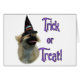 Serão truques ou ameaças neste Halloween? Nosso design de Natal tem sua raça favorita de cachorro, o espanhol tibetano, vestindo um chapéu de bruxa. Adicione um pouco de 'Hocus Pocus' a All Hallows este ano!