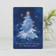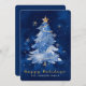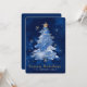 Envie cartões de natal elegantes com este marinho azul de Natal impressionante apresentando uma árvore de Natal aquarela embrulhada em fita de ouro e revestida com uma estrela de ouro. Cercado por delicados flocos de neve de ouro sobre fundo azul profundo, este design expele elegância refinada no inverno. Perfeito para enviar desejos de feriado aquecidos de um indivíduo, casal ou família que ama designs de Natal eternos e clássicos.
