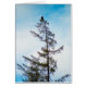 Uma fotografia de uma águia-calva americana tocando uma árvore de pinheiro alto. Um céu azul com nuvens negras está no fundo. Vestígios de luz solar e neve podem ser encontrados na árvore e são galhos. Imagem Copyright 2017 Kimberly J Tilley.
