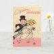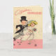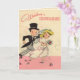 Totally retro. Pale peach and pink background with a cartoon bride and groom in tux and wedding gown hurrying through thrown confetti. The bride is blond and carrying her bouquet. At the top are the words "Wedding " ( in script) and "Congratulations" ( not in script). Both words are in pink. The inside is the same pale peach as the from with lettering the color of which matched the lettering on the from. The phrase inside is completely customizable. Feel free to adapt to you desires.
