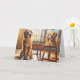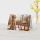 Um recuperador de ouros senta-se orgulhosamente ao lado de um cavalete que mostra um retrato de si mesmo semelhante à vida. O texto pode ser alterado.