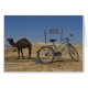 Camelo e bicicleta em frente a khettaras, ou poços conectados em túnel, perto de Erfoud, Marrocos