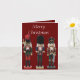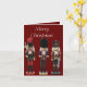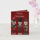Este cartão de Natal apresenta três soldados quebra-nozes de Natal tradicionais, coloridos e de madeira, um com um machado, um com pratos e um com uma espada. O fundo é vermelho escuro, com texto editável para torná-lo verdadeiramente pessoal.