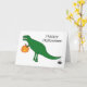 Um cartão de Dia das Bruxas de dinossauros T-rex para crianças. A frente apresenta um tiranossauro rex segurando uma abóbora e uma aranha está alegremente balançando sua cauda. A mensagem de Dia das Bruxas de dentro pode ser facilmente personalizada. Este cartão de Dia das Bruxas é excelente para amantes de dinossauros.