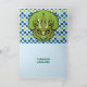 Personalize facilmente este cartão de aniversário fofo, que contém triceratops rostos em verde e azul, juntamente com padrões de bolinhas e tartan coordenados por cores.