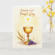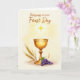 Este inspiracional cartão do Dia do Banquete apresenta um ouro com trigo de um lado e uva do outro, simbolizando o Eucarista, com luz radiante e as palavras "Bênçãos no Dia do Banquete". Uma bela maneira de celebrar qualquer dia de banquete católico ou cristão com reverência e alegria.