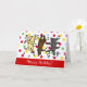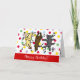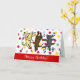 Cartão de Aniversário do Trío de Labrador Feliz Dançando. Três Labradores estão pulando de alegria. São incluídos um Labrador Amarelo, um Labrador Chocolate e um Labrador Preto. Temos vários desenhos. Você pode personalizar o texto como quiser. Remova o texto de exemplo e insira o seu. Criado por Naomi Ochiai do Japão.