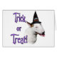 Serão truques ou ameaças neste Halloween? Nosso design de Natal tem sua raça favorita de cachorro, o Bull Terrier, vestindo um chapéu de bruxa. Adicione um pouco de 'Hocus Pocus' a All Hallows este ano!