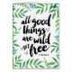 Todas as coisas boas são selvagens e livres. Belo cartão de saudação apresenta a citação de Thoreau em um texto preto nítido, rodeado por folhas botânicas verdes da selva, em aquarela. dentro de vazio para a sua mensagem.