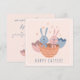 Kaart met illustratie van twee paashaasjes in een eierdopje. Tekst voorkant 'happy easter' (kan aangepast worden)