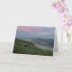A blank greeting card showing a contemplative woman sitting in sea grass and looking at Twin Rocks in Rockaway Beach, Oregon.