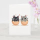 This greeting card shows two stylized kittens peeking out from cracked eggshells on a soft white background, with a gentle, friendly closeness between them 🐰. The left kitten is a deep charcoal color with wide dark eyes, a small sweet smile, and ears lightly tinted pink. Beside it, a light gray tabby with fine stripes and rosy cheeks looks calmly outward, as if sharing a quiet moment with its companion. Thin whiskers curl from both faces, adding a simple, lifelike touch without making the scene feel busy. Small red hearts float above and between their heads, suggesting affection and an easy bond 🐇. Any greeting text would sit near the top in a light gray tone, leaving plenty of open space around the illustration, while a short sign-off could be placed along the bottom in soft pink. The eggshell halves are shaded in warm tan and brown with jagged edges, framing each kitten like a little nest.